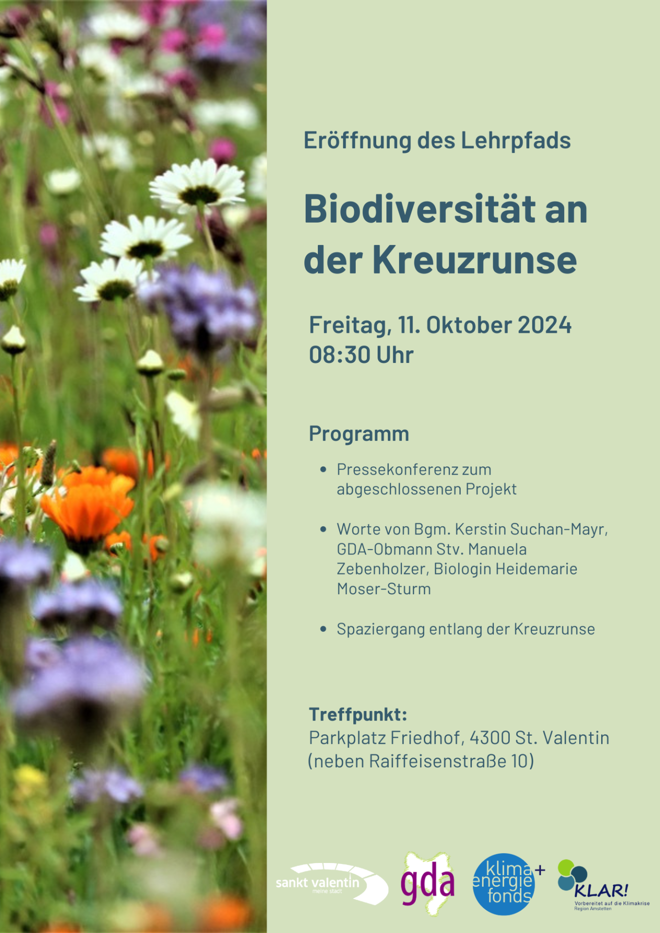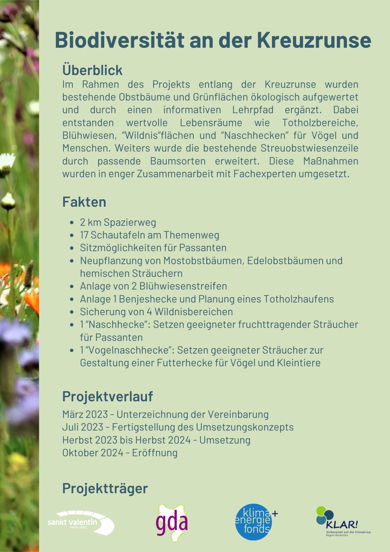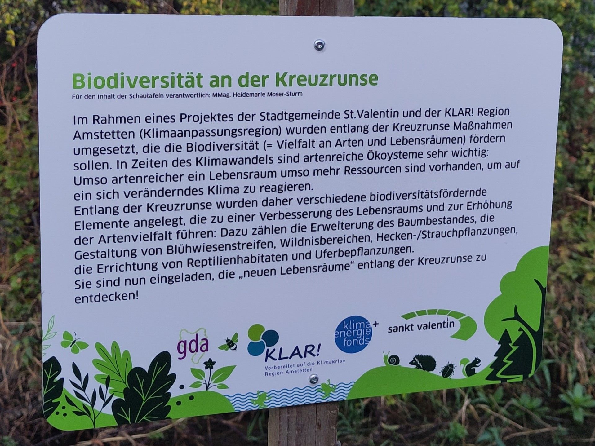 Dieses Wissen wird nun in einer Streuobstzeile im Stadtgebiet von St. Valentin angewendet. Diese verläuft entlang eines 2 km langen Spazierweges am Bach „Kreuzrunse“, zwischen Altenhofen und Kirchdorf, und wird als Themenweg gestaltet. In Verbindung mit dem Bach entstehen durch einfache Maßnahmen Vorzeigeprojekte zur Förderung der Biodiversität.